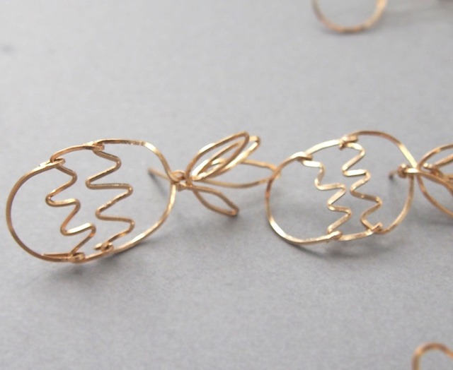 fun motif パイナップル ■片耳売りです ☆イヤリングはサンプル写真をご参照ください(イヤリングパーツの金具は合金・フェイクパールです) 名前の通り、楽しい・遊び心のあるモチーフシリーズ。 こちらはパイナップル。 装いのアクセントに、こなれ感をだすのにいかがでしょうか。 わざと落書きのように崩したデザインシルエットでありながら、 ワイヤーの張りをキープしながら1つ1つ制作しているので、大人の遊び心といった印象があります。 他にも色々なモチーフがあります。 是非ご覧下さい。 ■手作りの為、1つ1つ形が若干異なります。 その点楽しんでお使い頂ければと思います。 ワイヤーには若干作業跡があり、また一筆書きのように作成する為、ワイヤー同士が重なった部分は少し浮いたような着け心地になります。 ピアス慣れされている方にお勧め。細かい点気にされる方はご遠慮下さい。 ■縦4.8㎝程、横1.7㎝程 ■14金ゴールドフィルド、キャッチも同素材 配送方法によって、白のピローケース、ロゴ入りサークルケースにお入れいたします。ロゴ入り巾着、ロゴ入りサークルケースは現在無料でお付けしていますが、数がなくなり次第終了となります。