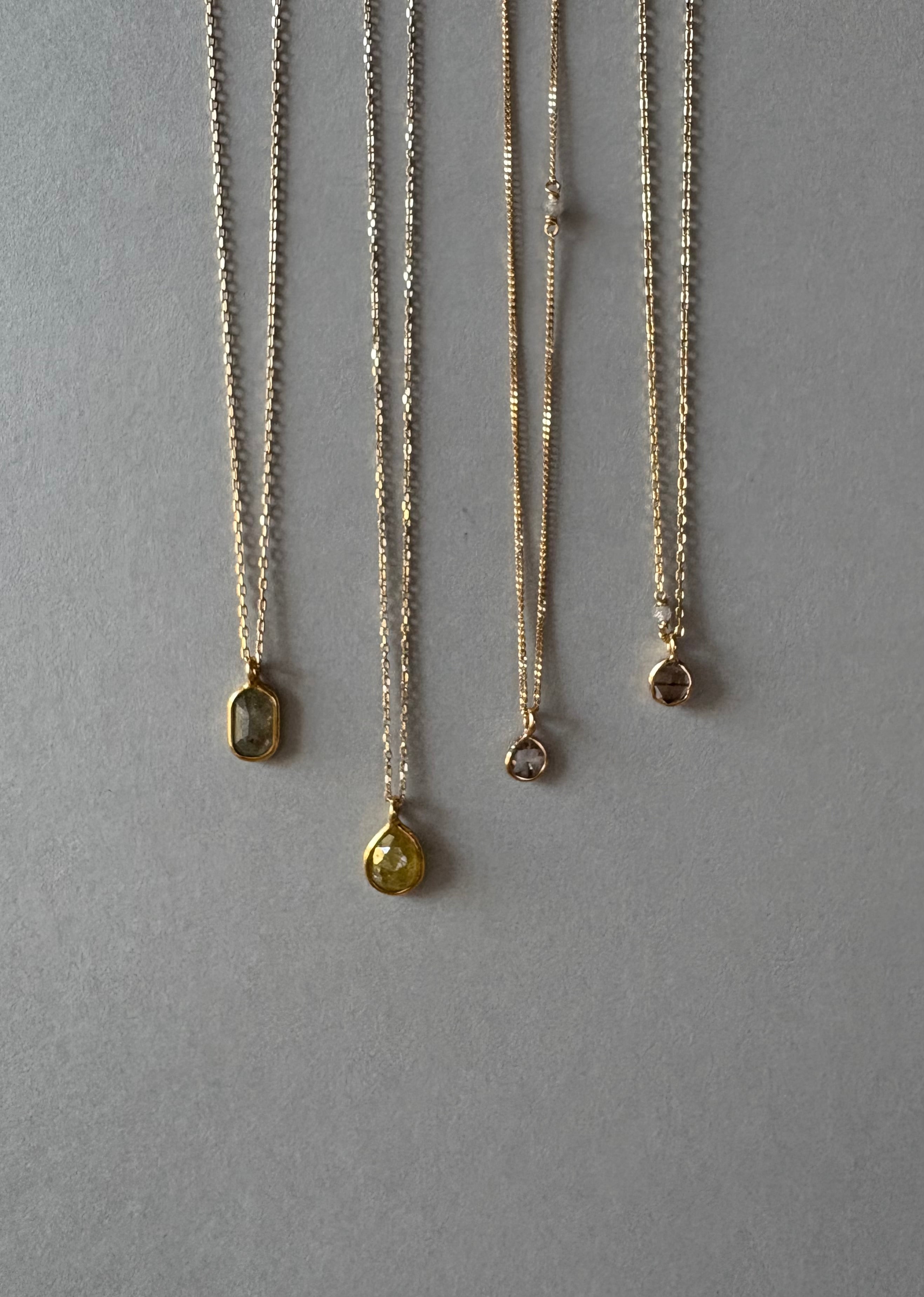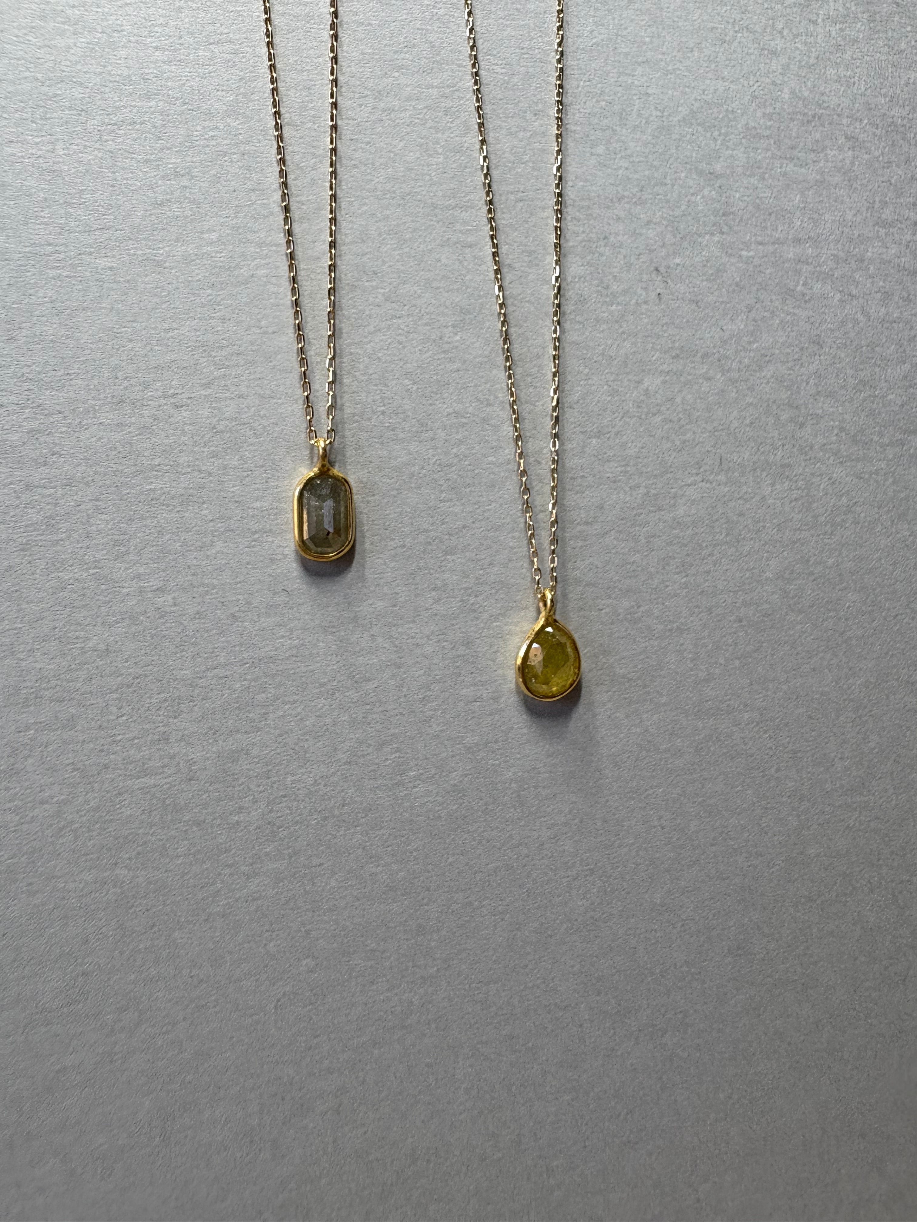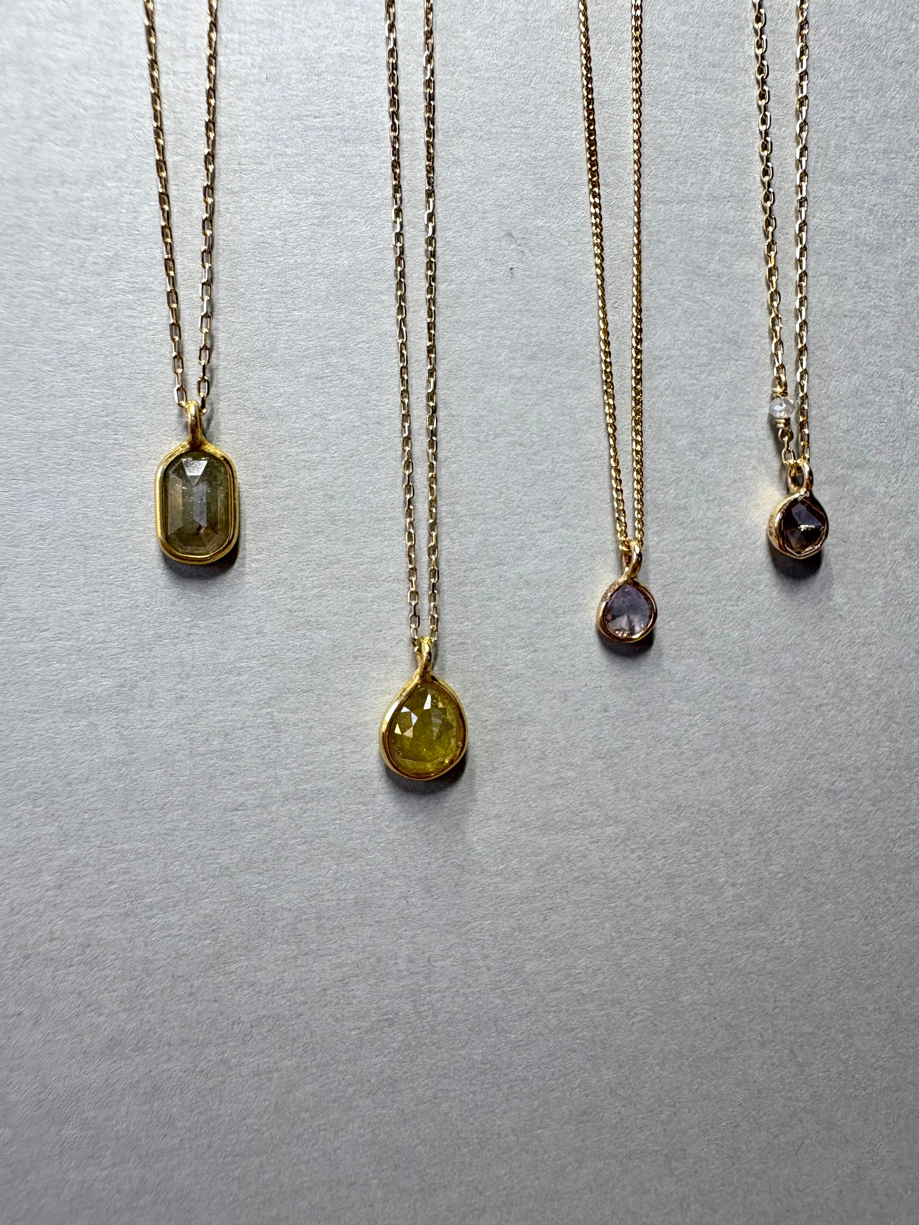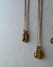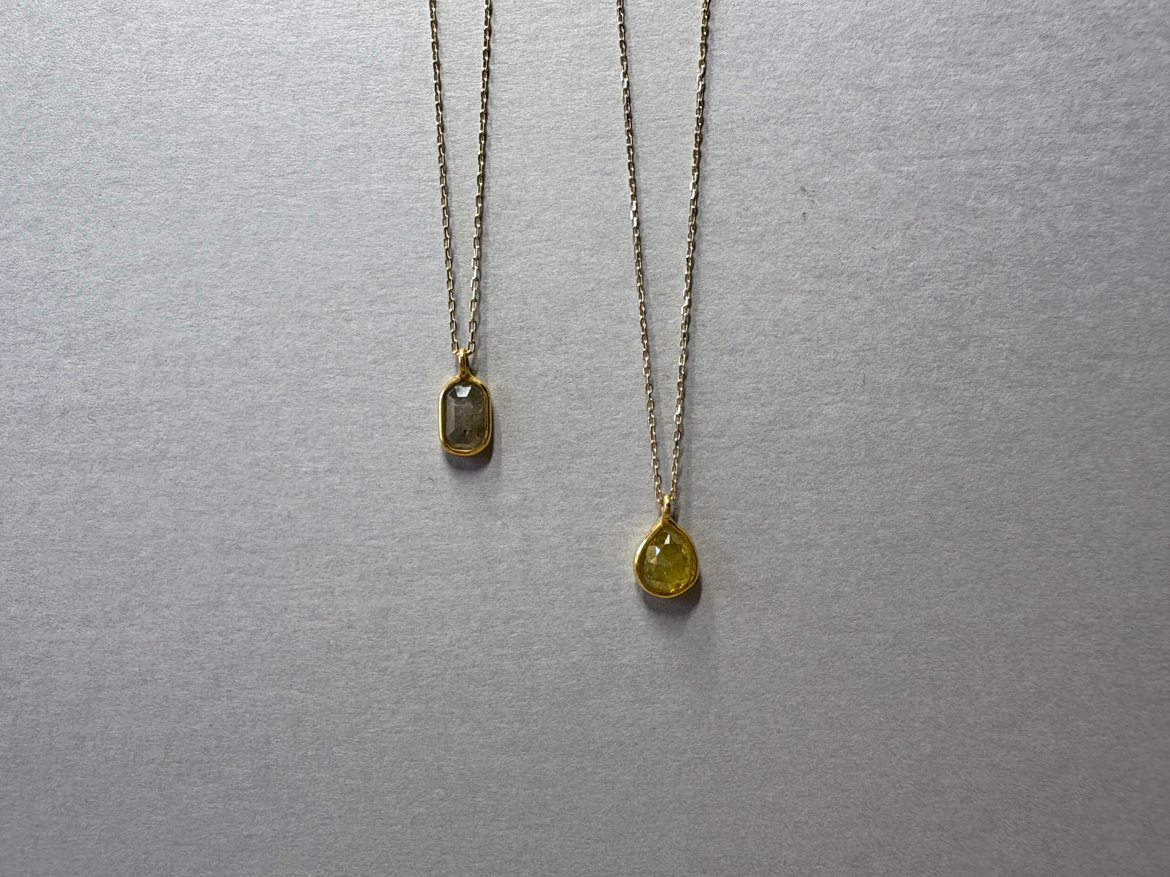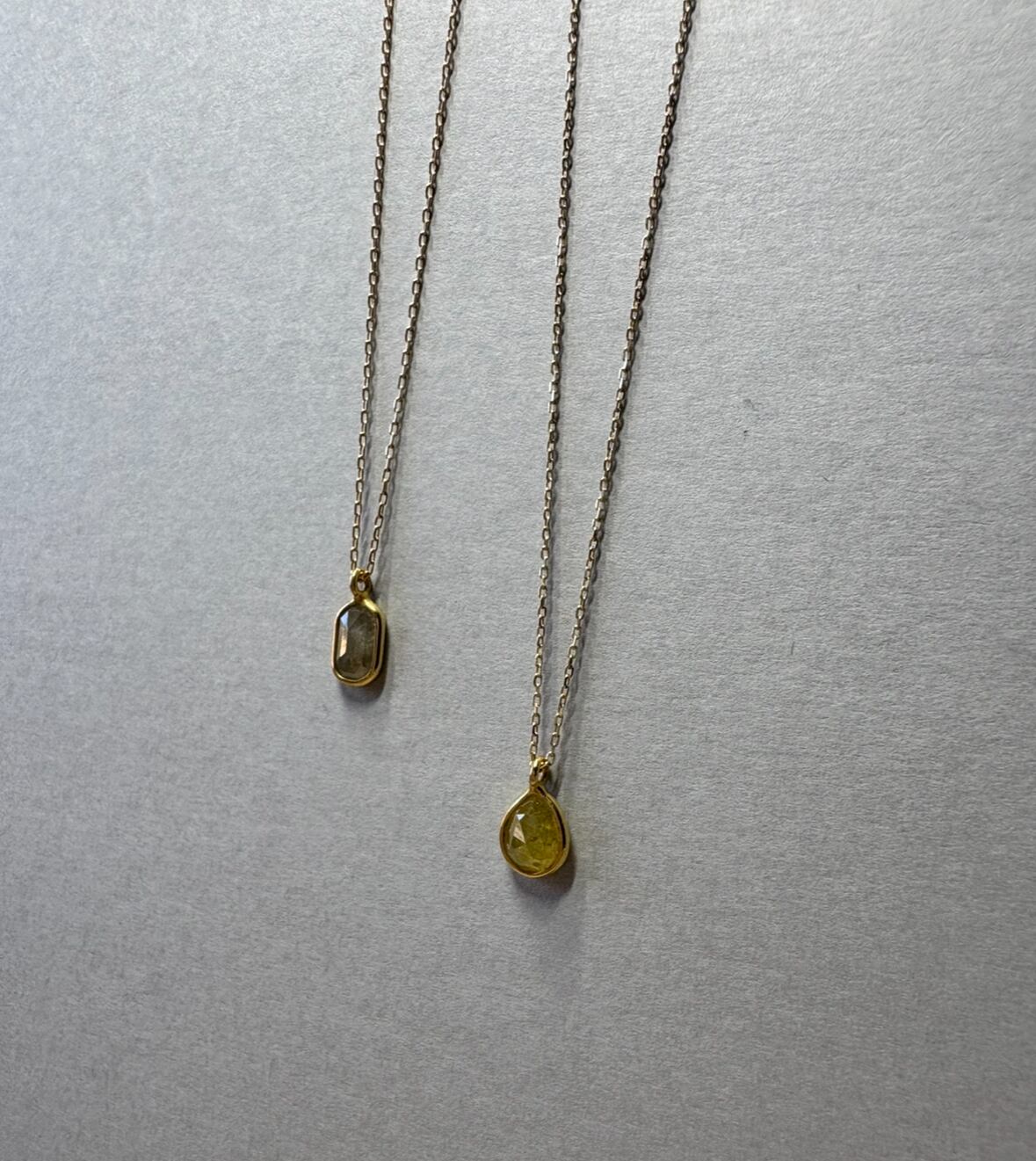 ②黄色いドロップ形のダイアは形はシンプルにさり気なく、ダイアモンドにしか出せないナチュラルで美しいイエローです。