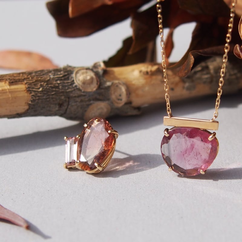シャープな印象のレクタングルカットのピンクトルマリンでを組合わせ、甘くなり過ぎない大人の赤系ジュエリーに仕上げました。