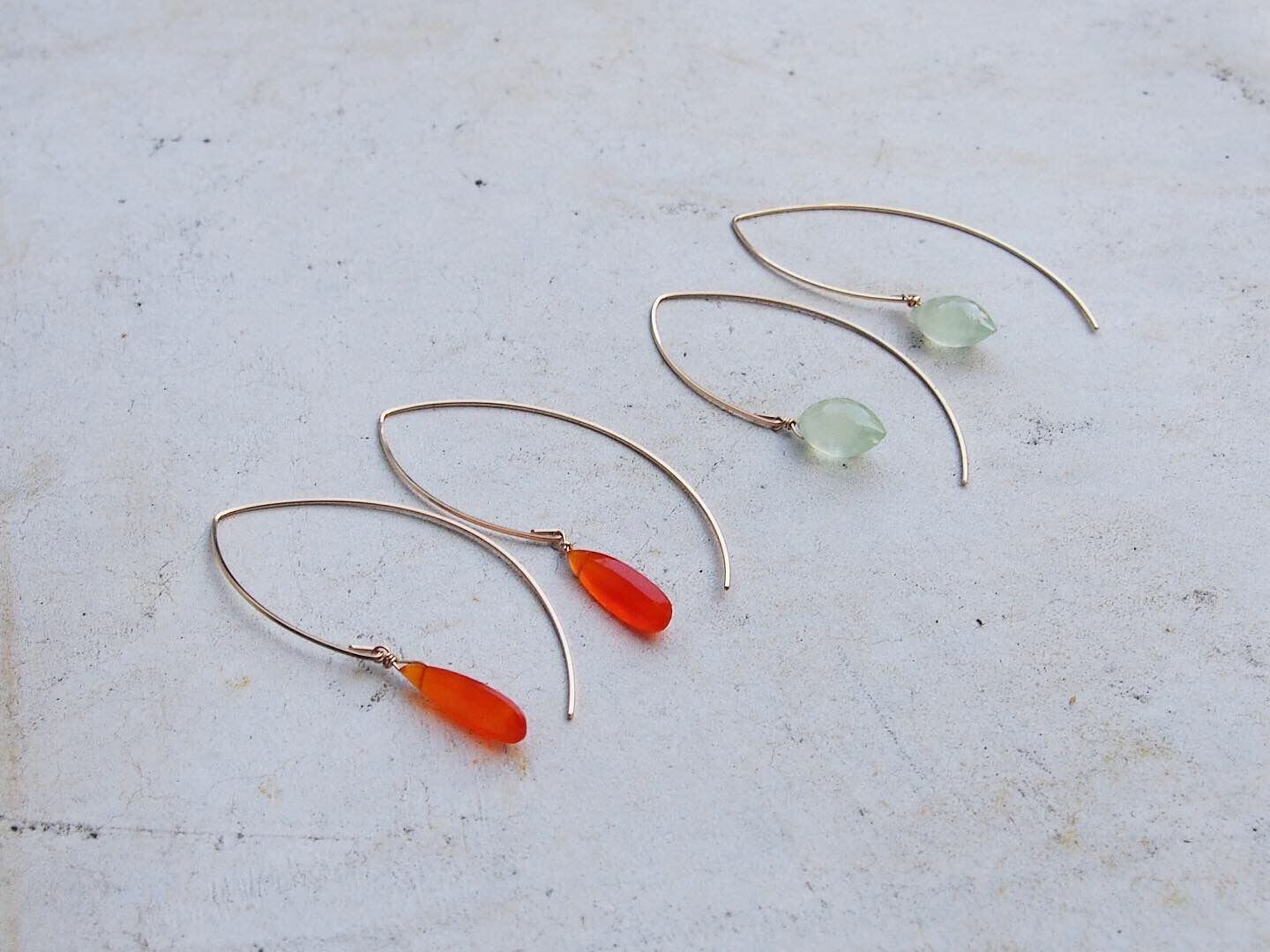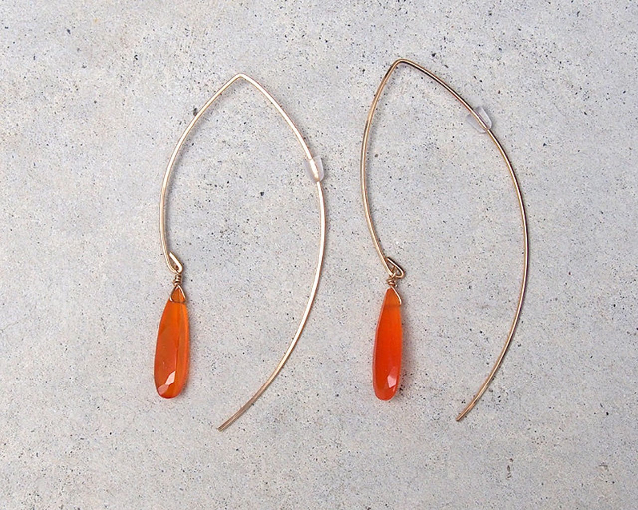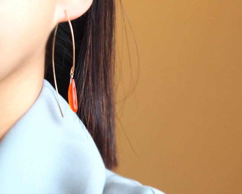 縦長ワイヤーデザインに、細長いペアシェイプカットのカーネリアンをつけた、大ぶりながらシンプルなデザインのピアス。