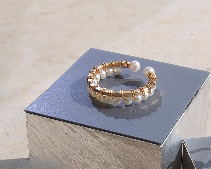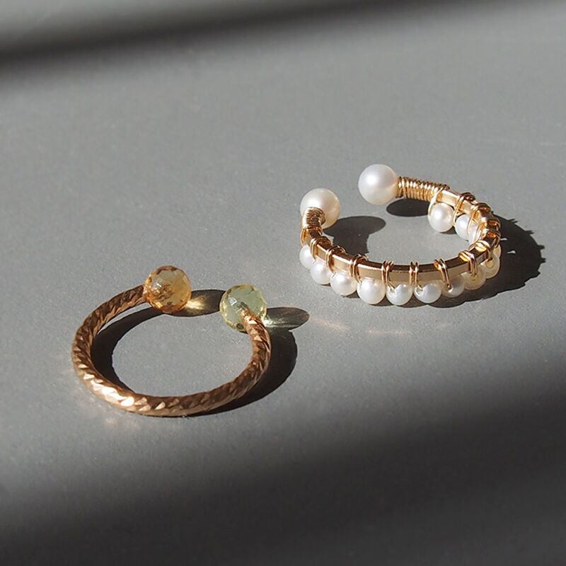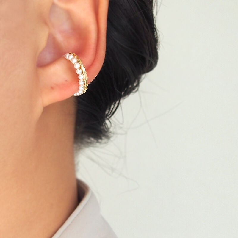小さなパールをスクエアのバーに沿わせて配した、他にないイヤカフデザイン。