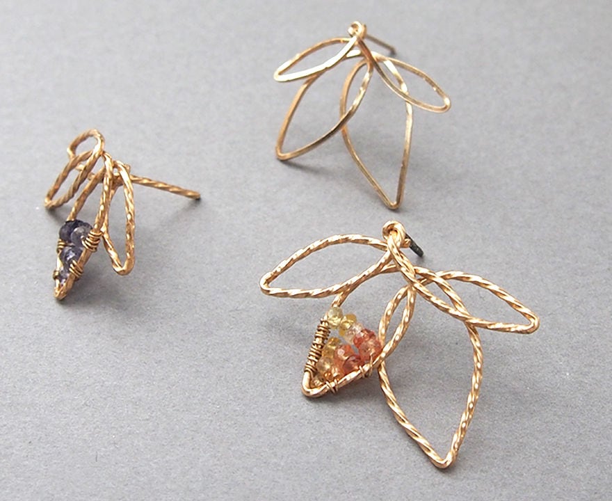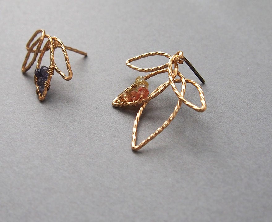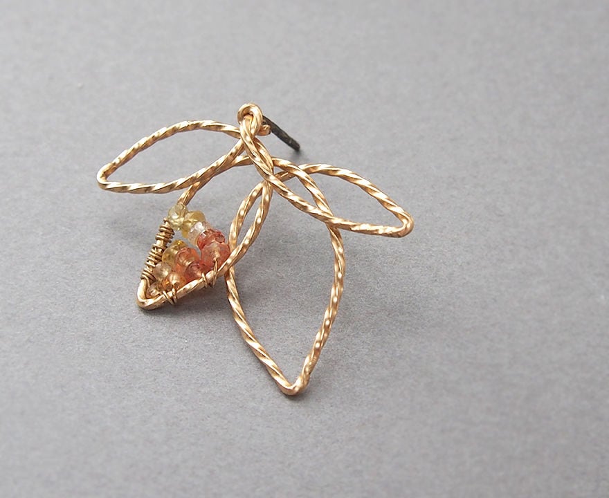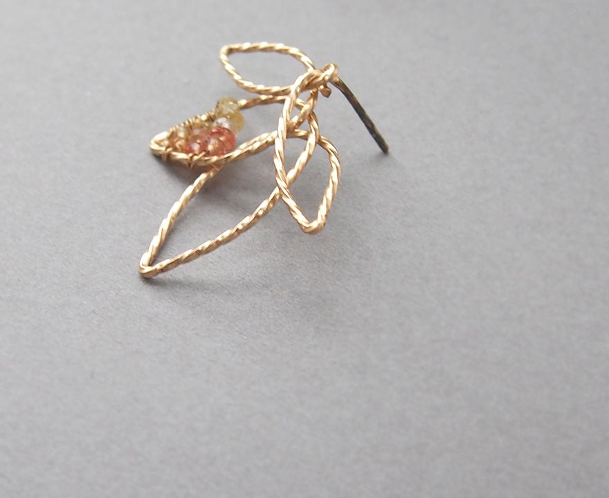 葉の一部には細かなカットが施されたイエロー~オレンジサファイアをグラデーションカラーで配しています。