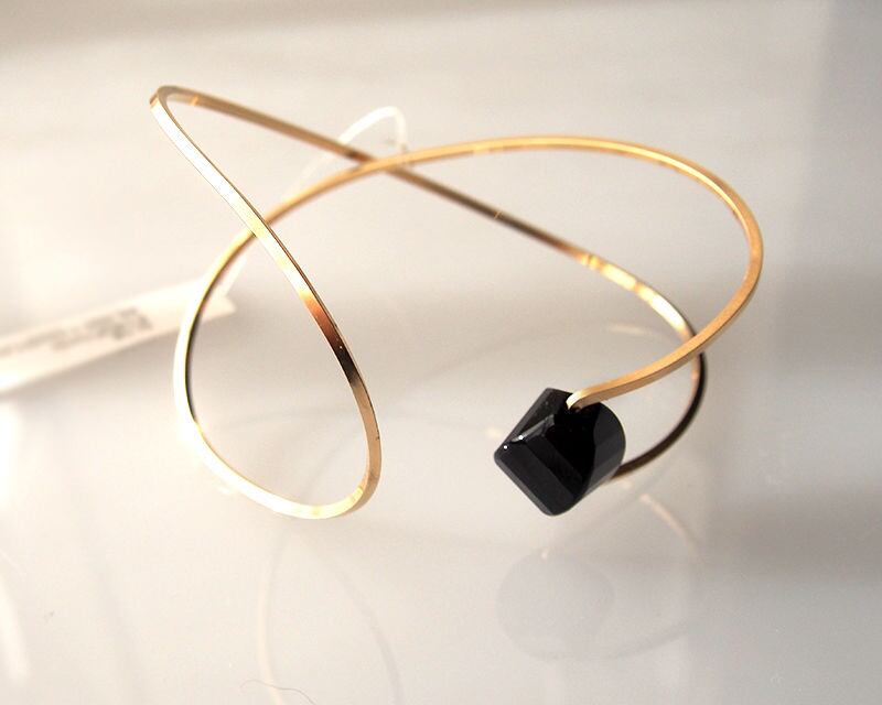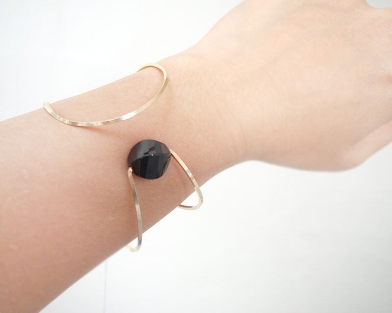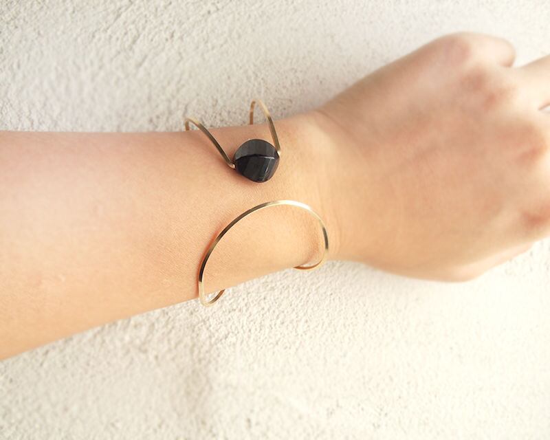 太いハリのある金具を使っていますので、腕にはめるときは腕の横からはめ、腕に入ったらきゅっと押して腕に馴染ませて下さい。