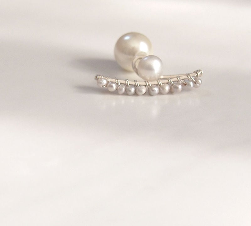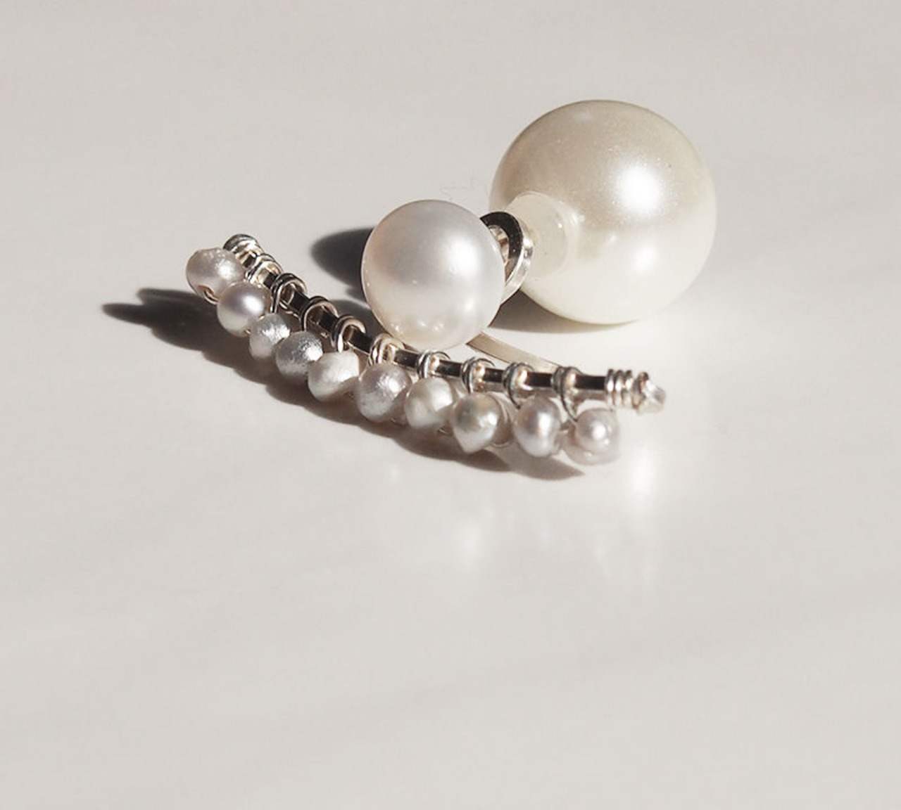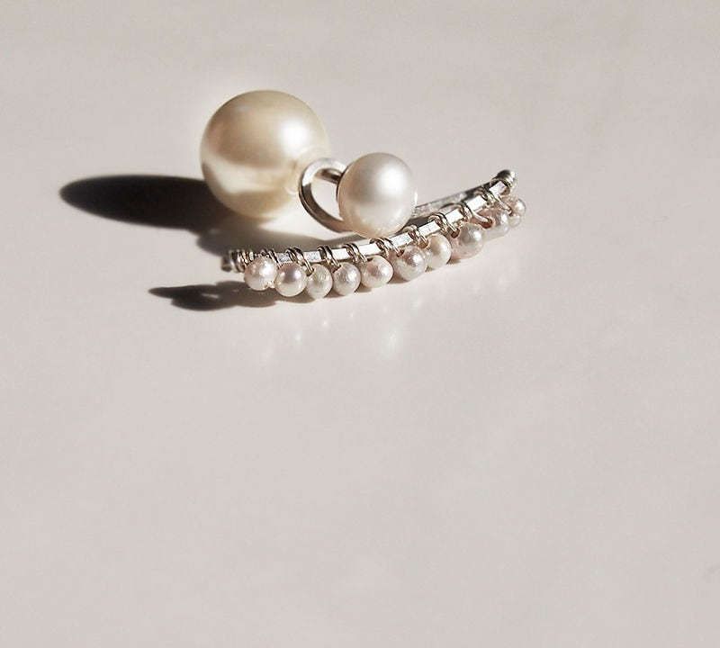 スクエアバーの下にベビーパールを配し、耳たぶの下に添うデザイン。