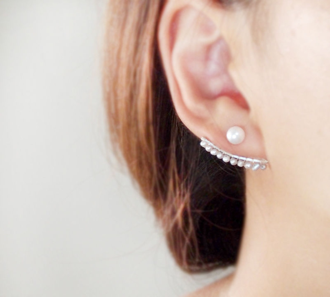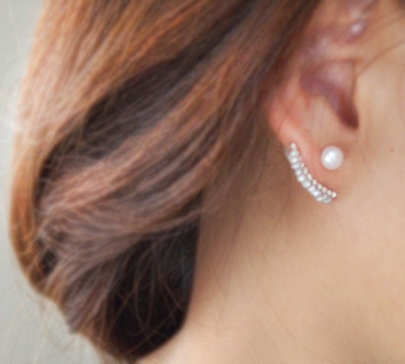 パールピアスをピアスホールに入れ、耳の後ろに下がりを下げてパールキャッチをはめて着用してください。