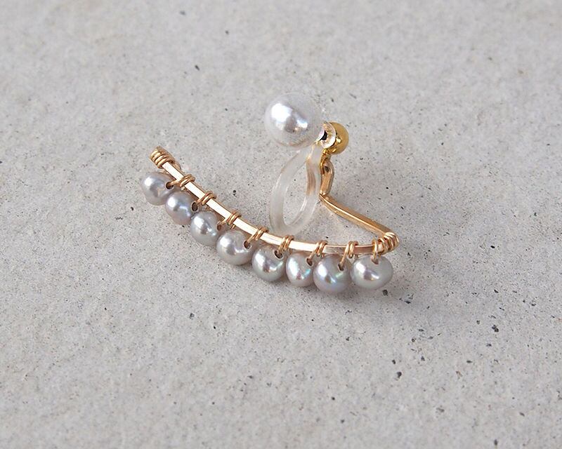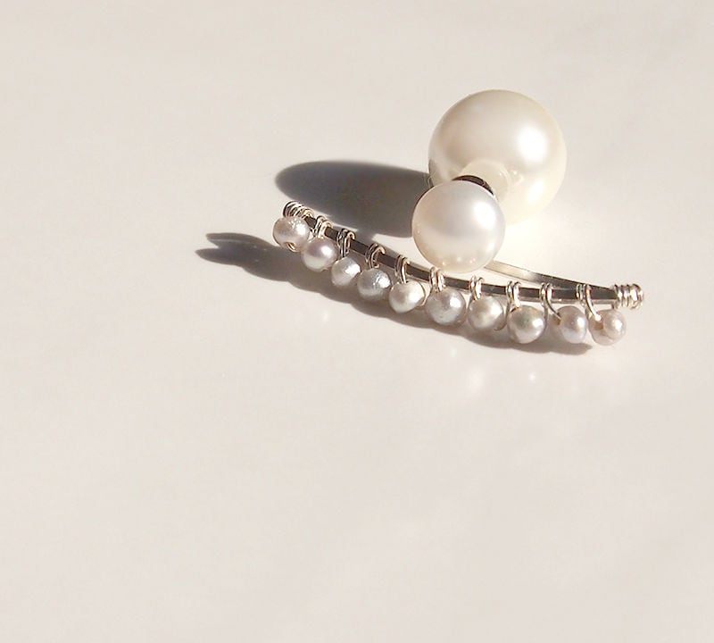 小さなグレーのケシパールをスクエアのバーに沿わせて配した、シンプルでありながら他にないパール使い。